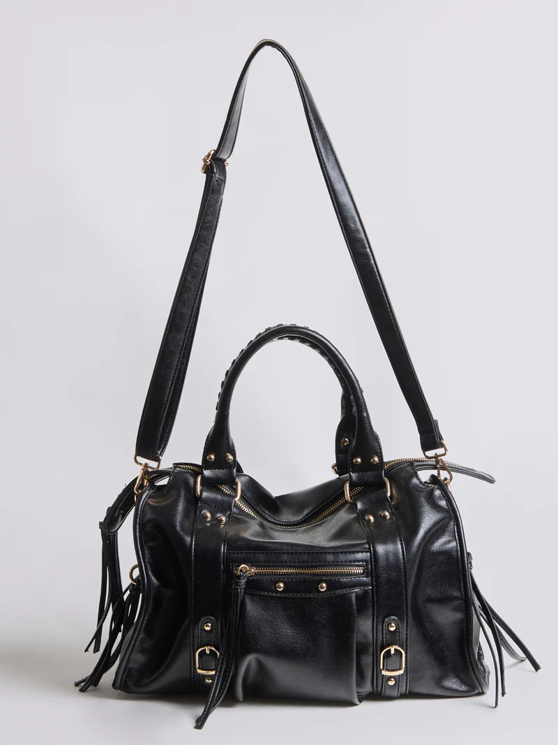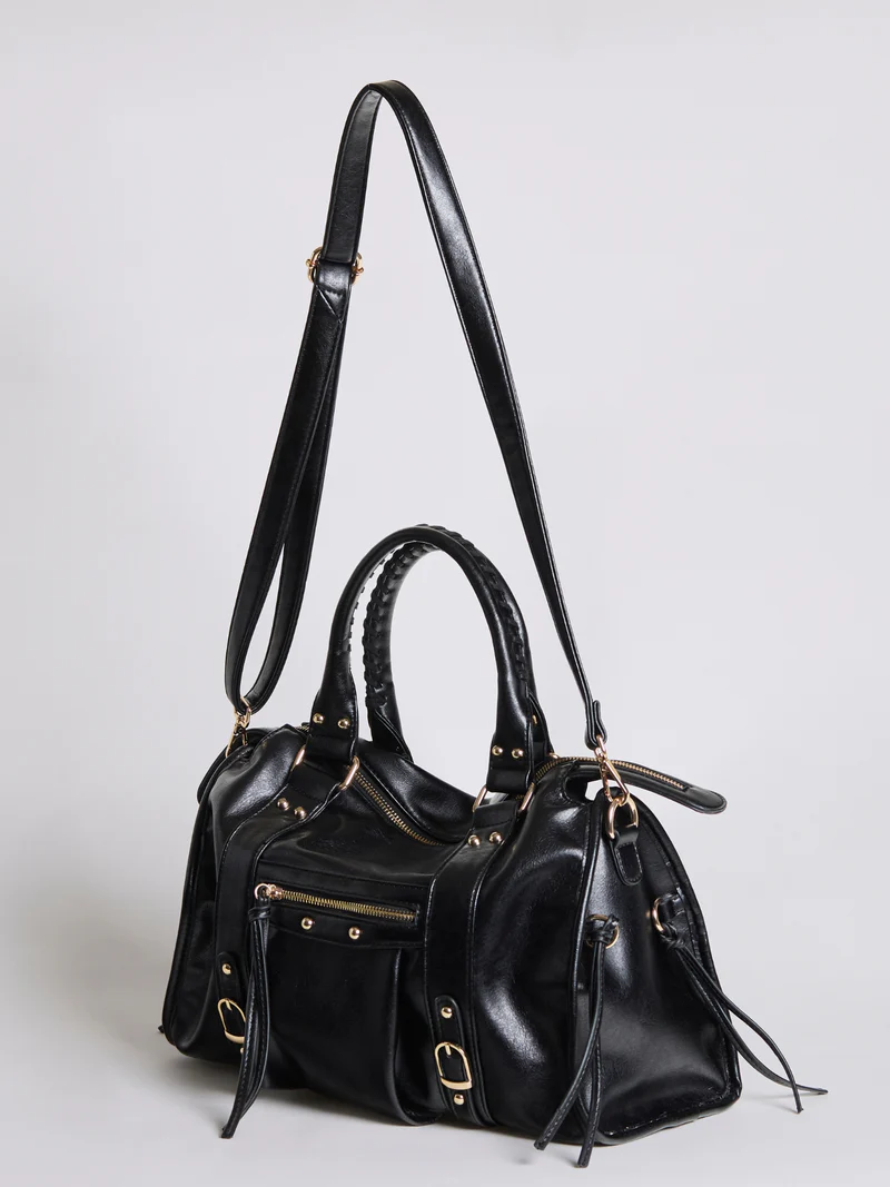 It features a sturdy short handle for a stylish look in your hand and a detachable long strap for a comfortable crossbody carry.