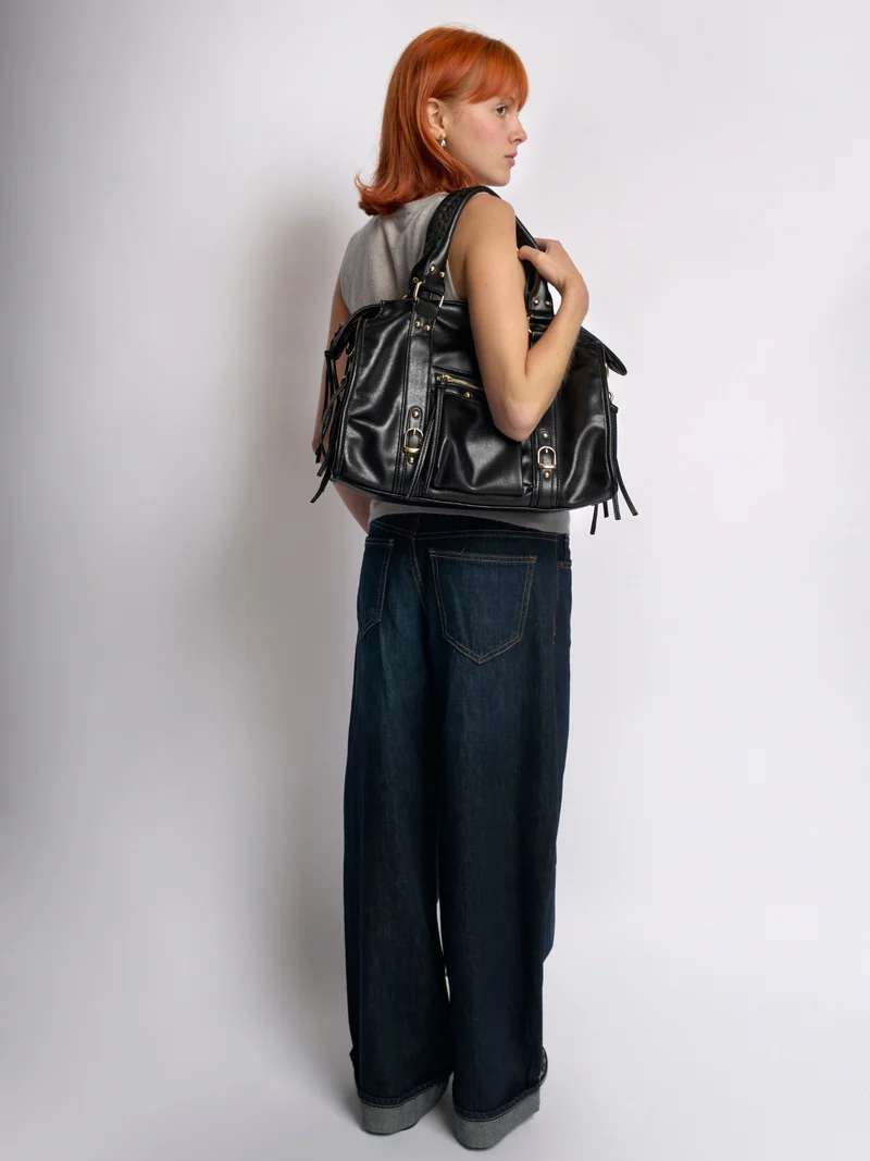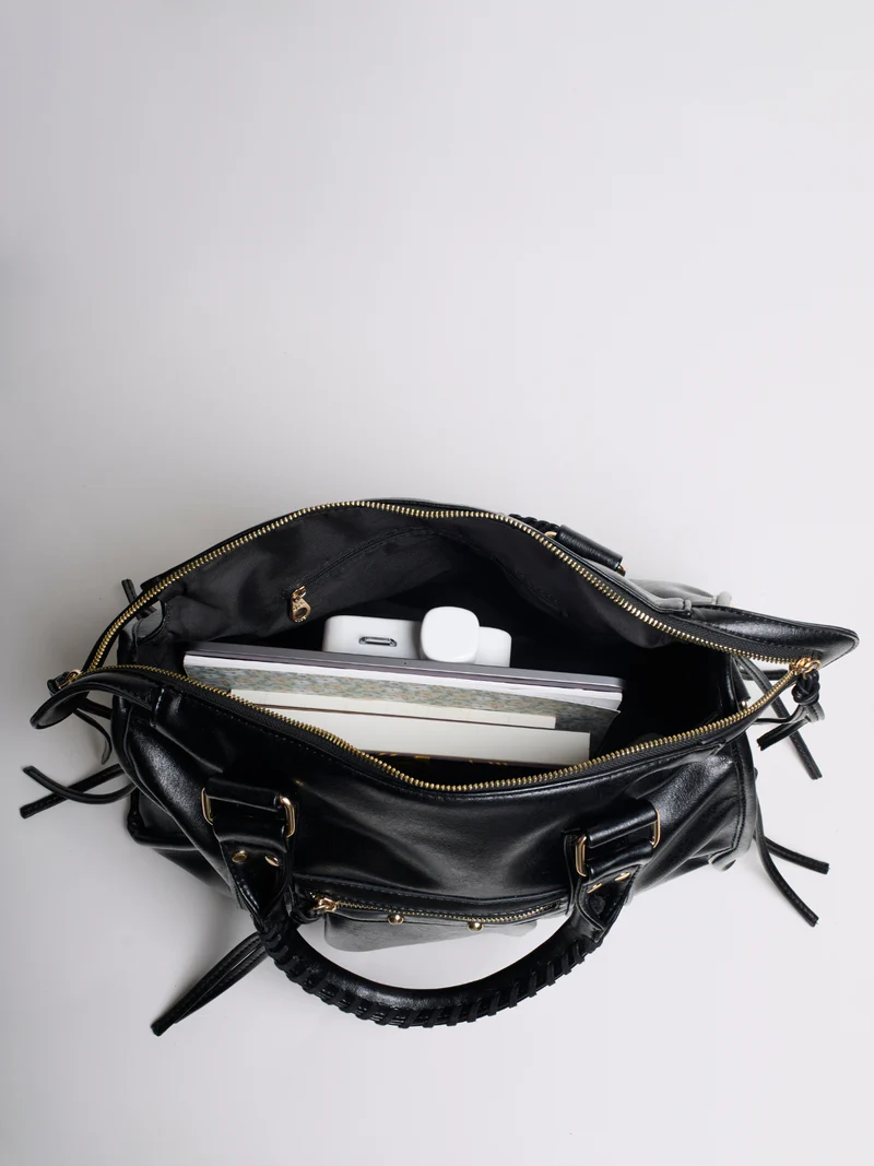 Made from high-quality vegan leather, the bag is accentuated by elegant gold details.